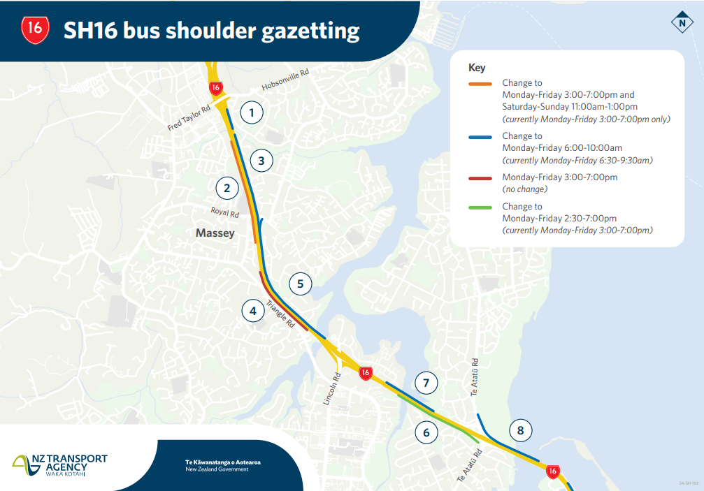 NZ Transport Agency Waka Kotahi (NZTA) is seeking feedback to be implemented by bylaw to increase the operating window of the emergency stopping lanes as bus-only lanes along SH16.