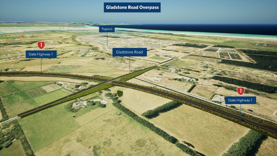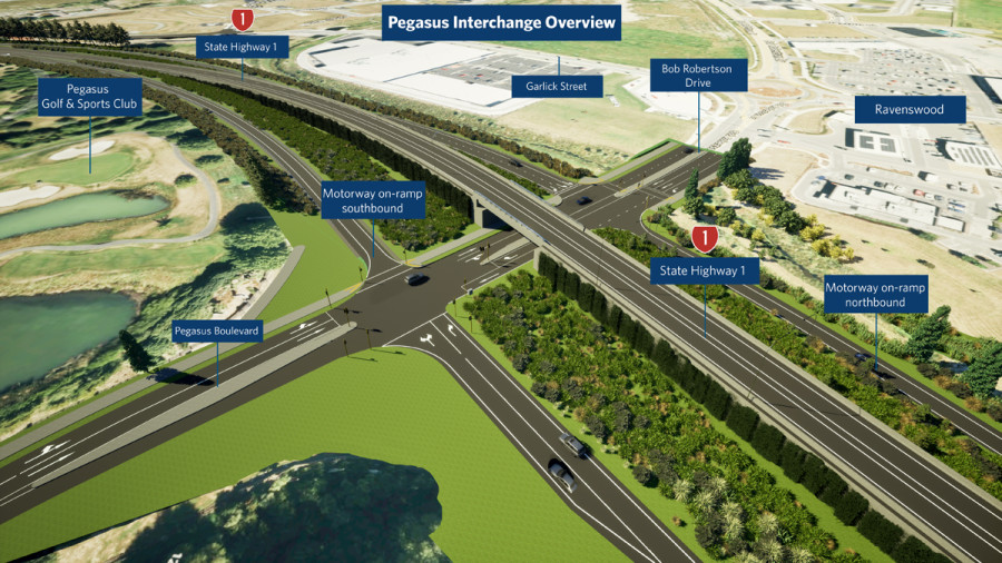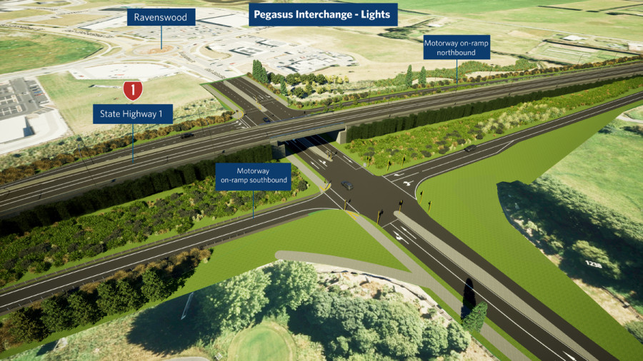 Recognising the significant growth in the Pegasus, Ravenswood and Woodend communities since the original scheme design was developed, a motorway overpass with signalised on and off ramps will be included in the design where the Pegasus roundabout is now. The signalised intersections provide safer crossing facilities for pedestrians and cyclists between Ravenswood and Pegasus.