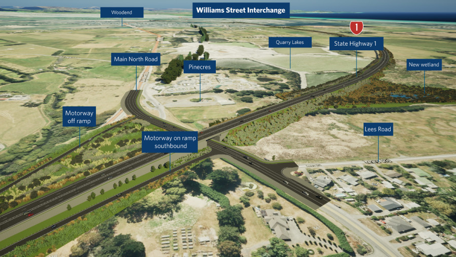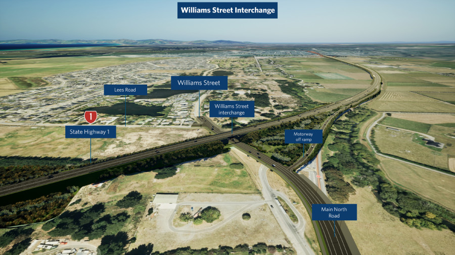There will be a grade separated interchange (overpass) at the intersection of SH1 and Williams Street, Pineacres. An off-ramp is included for traffic accessing Woodend via Main North Road and Kaiapoi via Williams Street.