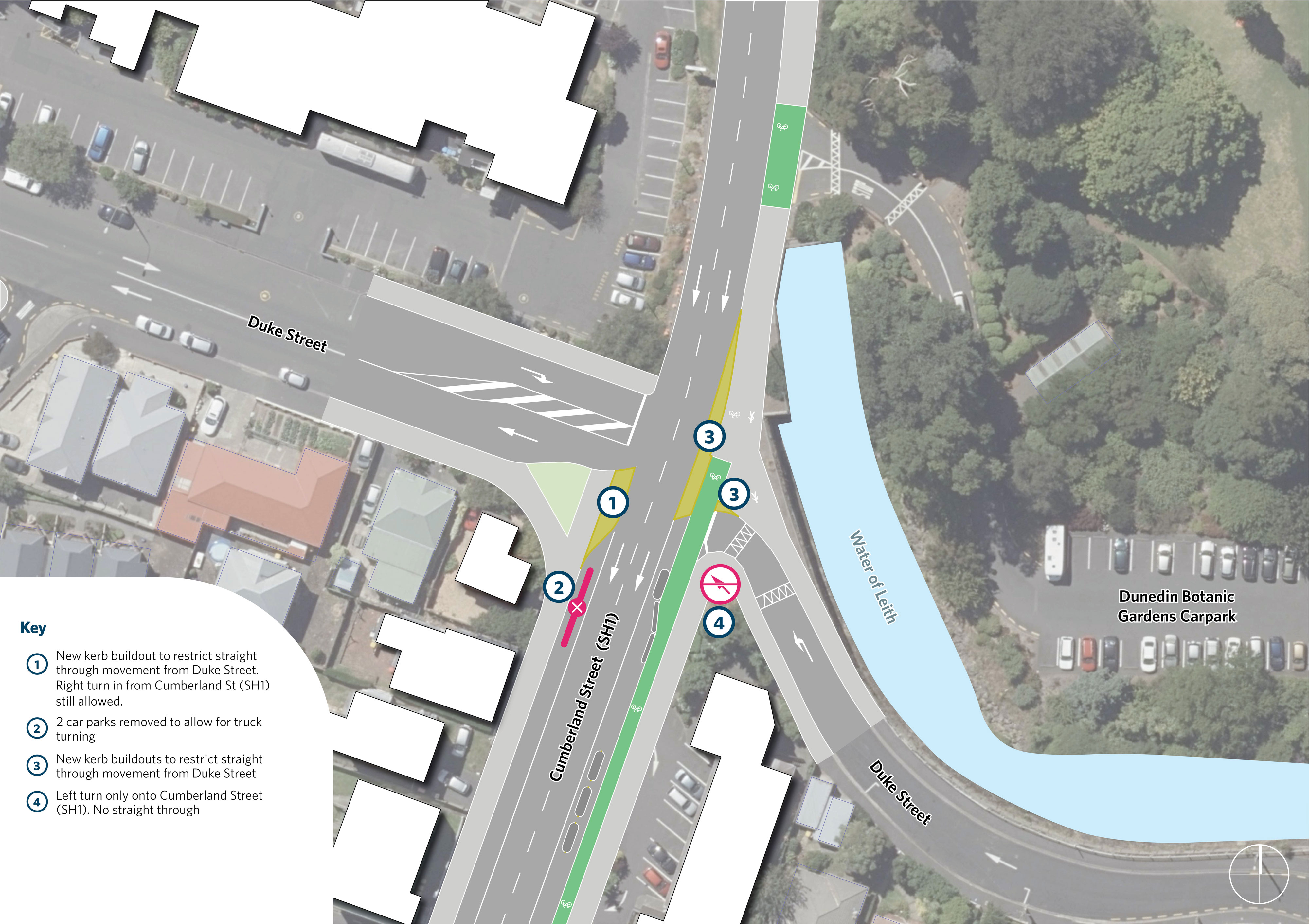 Our preferred solution is to move the SH1 northbound lane about 10 meters into a small area of the Town Belt to improve visibility and safety for drivers at the intersection. This will also make the intersection more efficient for those driving to North East Valley.