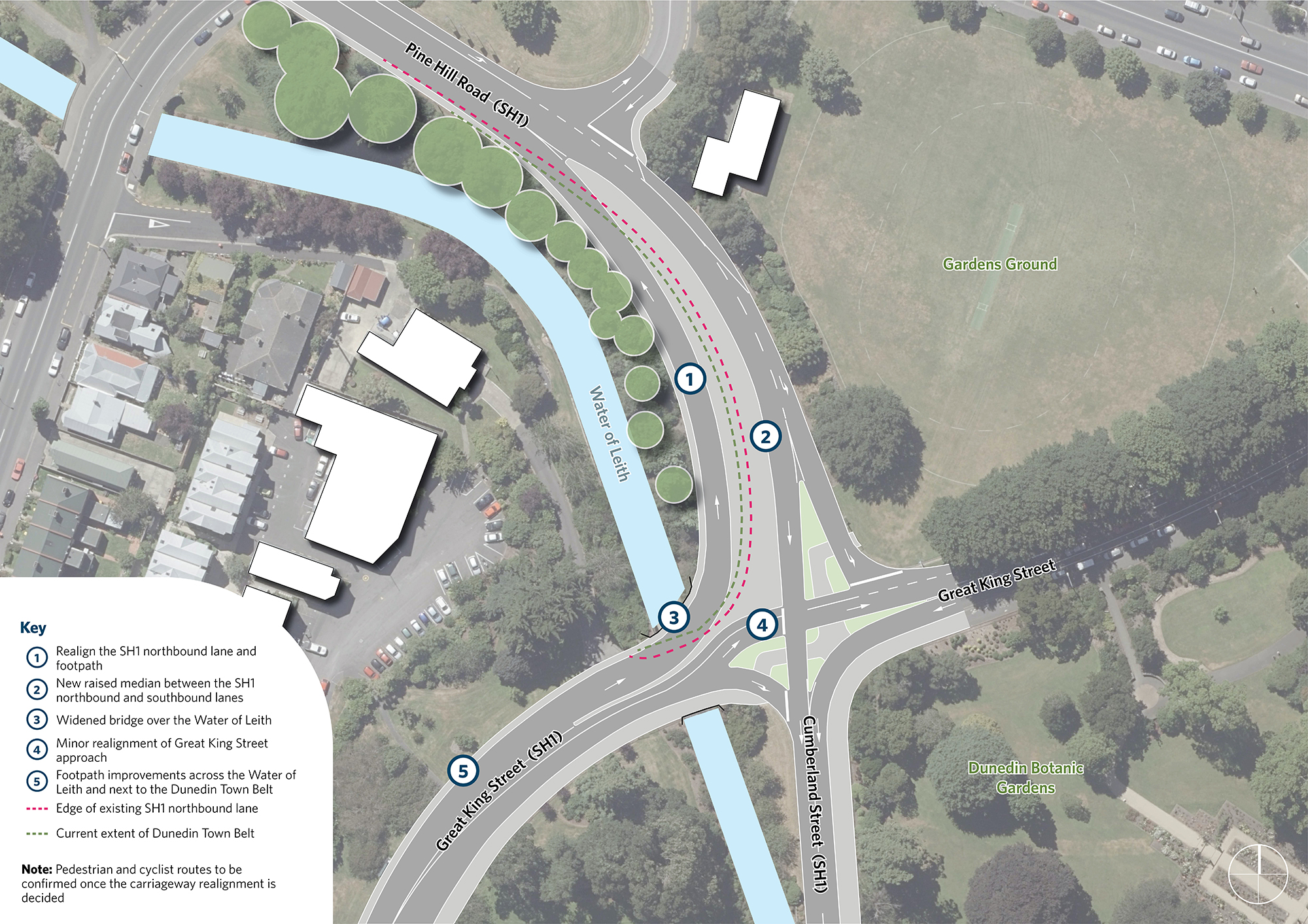 See the slider map that shows the proposed changes to the current realignment of Pine Hill/ Great King Street and how they would affect the Dunedin Town Belt.