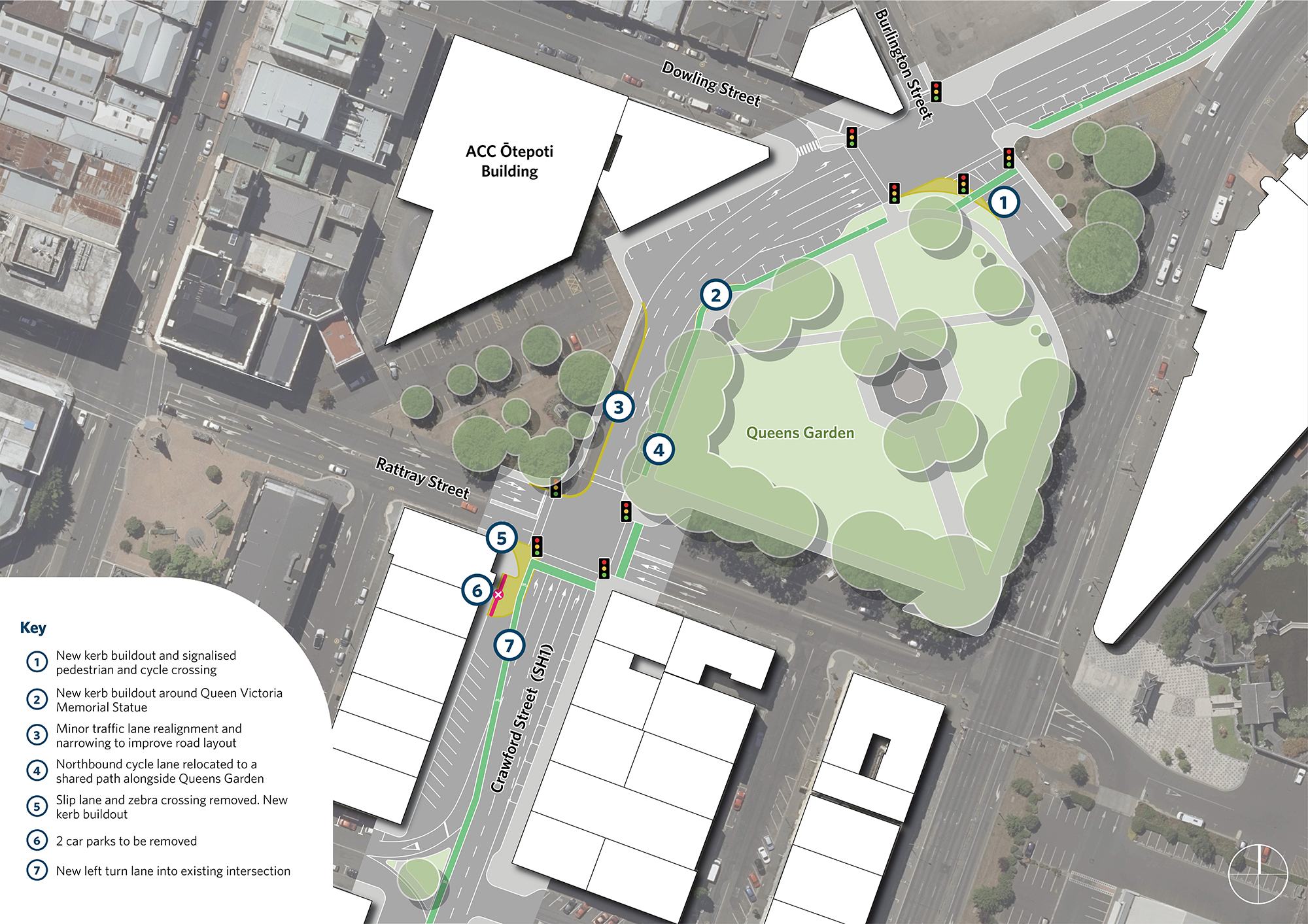 CloseWe have several safety improvements planned for SH1 northbound near Queens Gardens. With the new ACC building on Dowling Street opening at the end of 2025 accommodating over 800 staff, pedestrian activity in the area will increase significantly. To address the safety risks posed by higher foot traffic and fast-moving vehicles, we are proposing upgrades that will improve pedestrian crossings while ensuring efficient traffic flow.