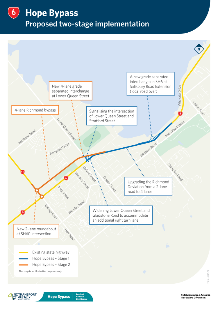 Stage 2 includes a new 4-lane Richmond bypass (on the existing designation which is currently part of the railway reserve), a new four-lane grade-separated interchange at Gladstone Road/Lower Queen Street intersection, and a new 2-lane roundabout at SH60 intersection.