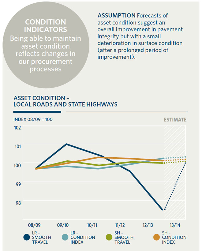 Length of road construction and new roads completed (lane km) Length of bridge replacements (lane km) % of sealed network resurfaced (based on road length in lane km) % of network rehabilitated (based on road length in lane km) % of unsealed network metalled (based on road length in centreline km) Safe stopping: % of travel on network above skid threshold Network resilience: % of rutting >20mm over state highway network Smooth ride: % of travel on network classed as smooth Availability of state highway network: % of unplanned road closures resolved within 12 hours |