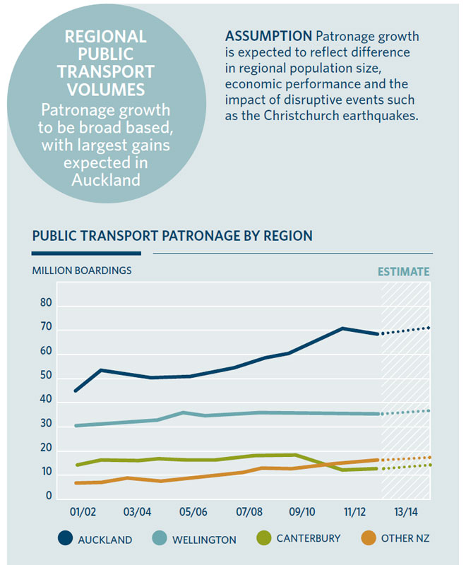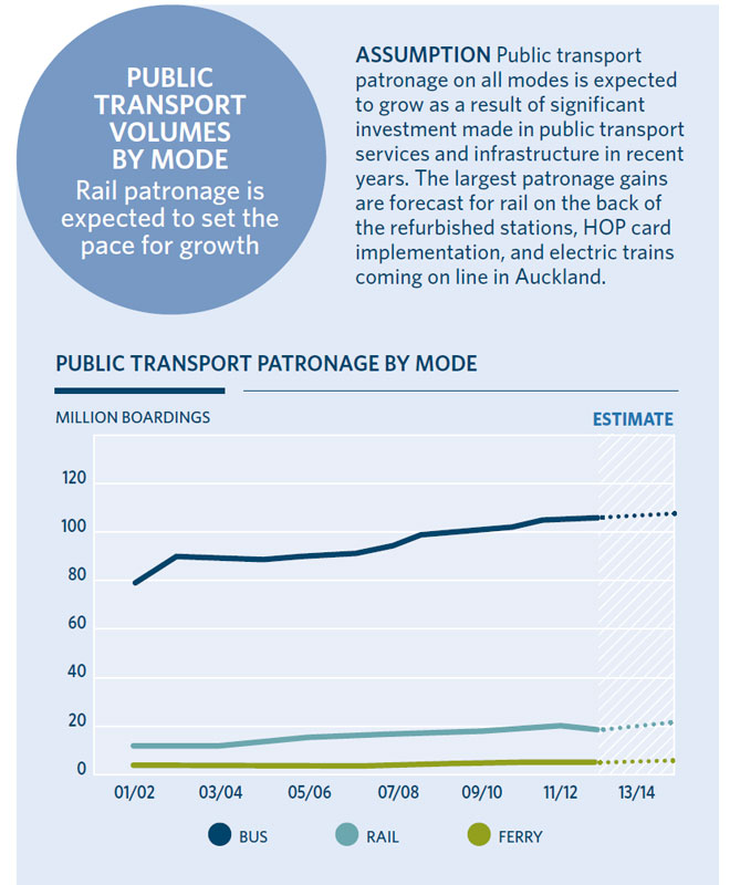 Fare revenue as a % of total expenditure Length of road construction and new roads completed (lane km) Length of bridge replacements (lane km) % of sealed network resurfaced (based on road length in lane km) % of network rehabilitated (based on road length in lane km) % of unsealed network metalled (based on road length in centreline km) Kilometres of new footpaths, cycle lanes and cycle paths Number of passengers using urban public transport services (bus, train and ferry)* Pavement integrity of the sealed network Surface condition of the sealed network Average number of days taken to deliver % of activities delivered to agreed standards and timeframes % of target audience aware of road user safety messages Road Policing Programme (refer to page 24) Cost of emergency reinstatement |