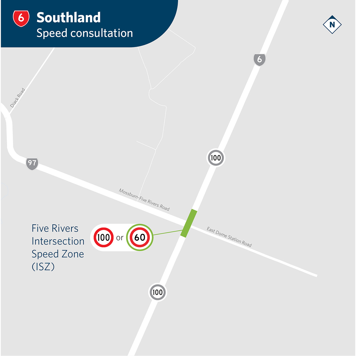 We’re proposing an ISZ which has electronic variable speed limit signs to temporarily show a lower speed limit of 60km/h on SH6. This makes it easier and safer for people to pull into or out of SH97 across a high-speed rural road, while avoiding unnecessary delays.