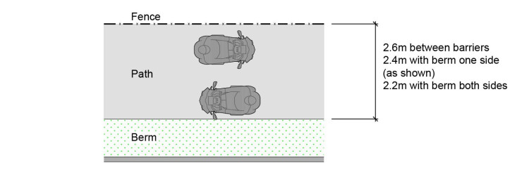 The clearance for one mobility scooter can be as little as 1.2m if a vertical element is on only one side (e.g., the other side is a grass verge) but must be at least 1.3m if there is a vertical element on both sides.