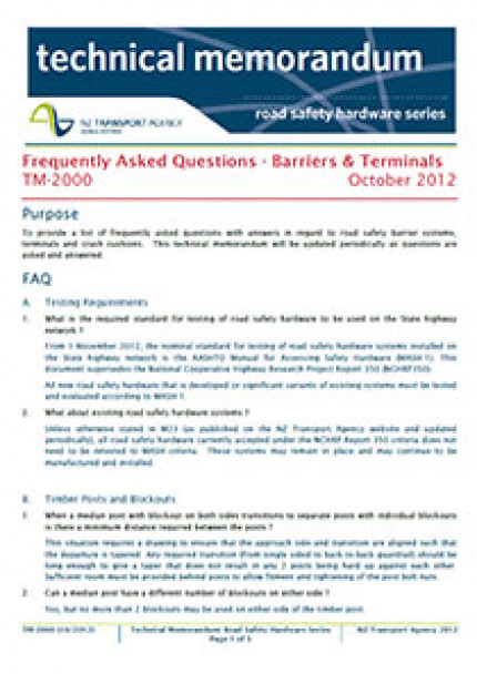 To provide a list of frequently asked questions with answers in regard to road safety barrier systems, terminals and crash cushions. This technical memorandum will be updated periodically as questions are asked and answered.