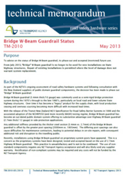 From July 2013, bridge W-beam guardrail is no longer to be used for new installations on state highway structures. Repair of existing installations is permitted where the level of damage does not warrant system replacement.
