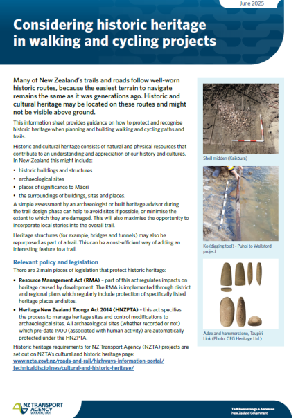 This information sheet provides guidance on historic and cultural heritage considerations in walking and cycling projects. It includes steps to follow during the planning, design, and construction phases of a project.
