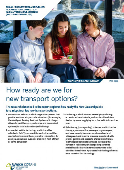 The research found that New Zealanders have a good knowledge of CAVs and app-based ridesharing, but few have heard about ridesharing and carsharing schemes. There are also widespread safety concerns alongside issues of availability, cost and convenience. However, comparisons with international data suggest that at the time of writing this report the New Zealand public was more aware and ready to use CAVs than some overseas jurisdictions.