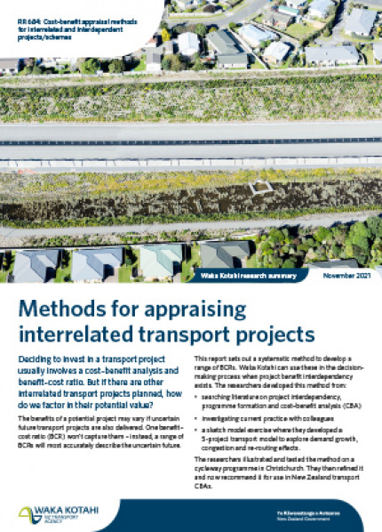 This study was commissioned to fill a knowledge gap as there is currently no methodology to assess interdependent and interrelated projects/programmes. The study identified and developed a framework and methodology for assessing interrelated and interdependent projects/programmes. The researchers illustrated and tested the method on a cycleway programme in Christchurch. They then refined it and now recommend it for use in New Zealand transport CBAs. The findings of the study will be assessed and incorporated in the Monetised Cost and Benefits Manual as appropriate.