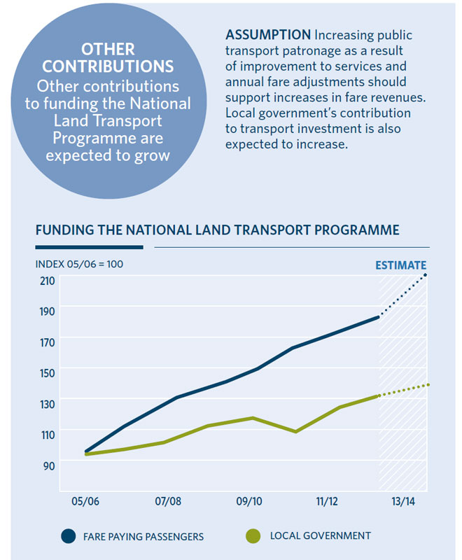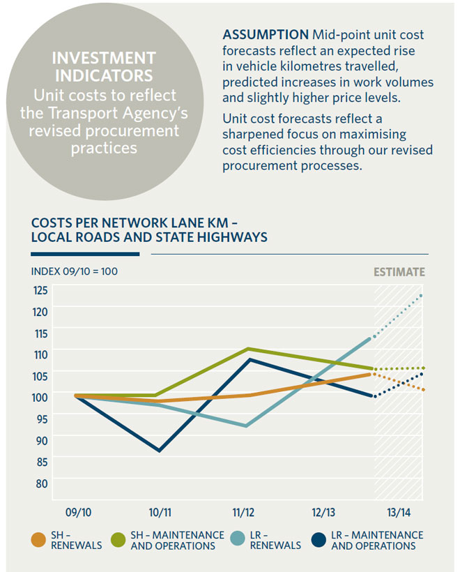 Fare revenue as a % of total expenditure Length of road construction and new roads completed (lane km) Length of bridge replacements (lane km) % of sealed network resurfaced (based on road length in lane km) % of network rehabilitated (based on road length in lane km) % of unsealed network metalled (based on road length in centreline km) Kilometres of new footpaths, cycle lanes and cycle paths Number of passengers using urban public transport services (bus, train and ferry)* Pavement integrity of the sealed network Surface condition of the sealed network Average number of days taken to deliver % of activities delivered to agreed standards and timeframes % of target audience aware of road user safety messages Road Policing Programme (refer to page 24) Cost of emergency reinstatement |