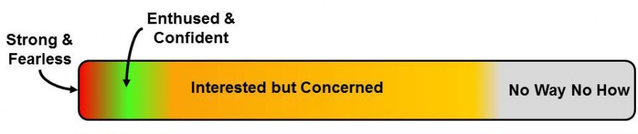 The proportions of each group are not determined by the cycling provision currently available, rather they reflect the people who will cycle that will change as conditions improve or get worse. Proportions might vary according to local culture and other demographic factors, and it is not possible to clearly assign every person into one of the categories. It should also be noted that an individual may change over time, and become more confident over time through training or experience (ie move leftwards on the chart). Alternatively, an individual having or hearing about a bad cycling experience may become more risk-averse (ie move rightwards on the chart).